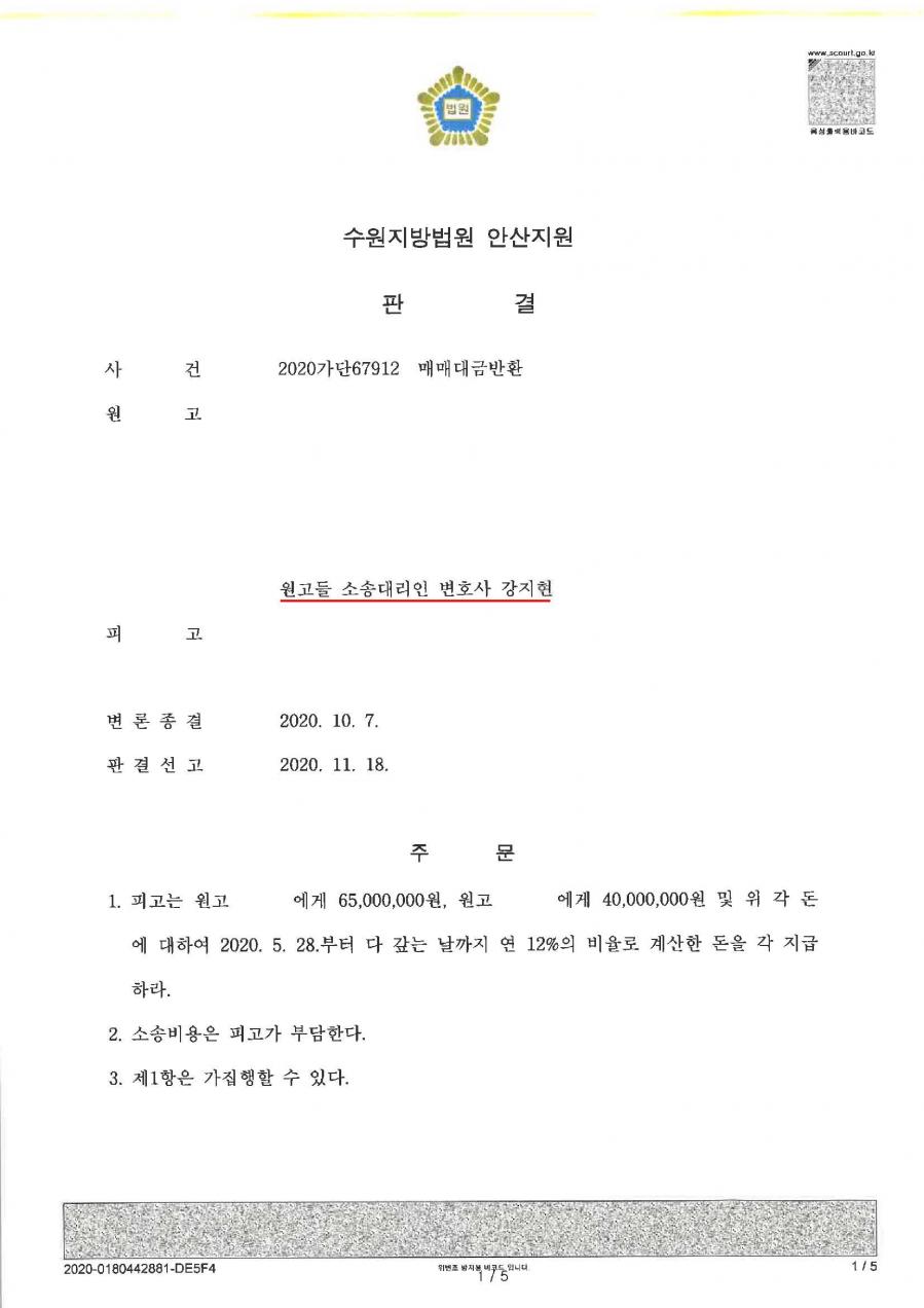 - 사건 : 수원지방법원 안산지원 2020가단67912호 매매대금반환
